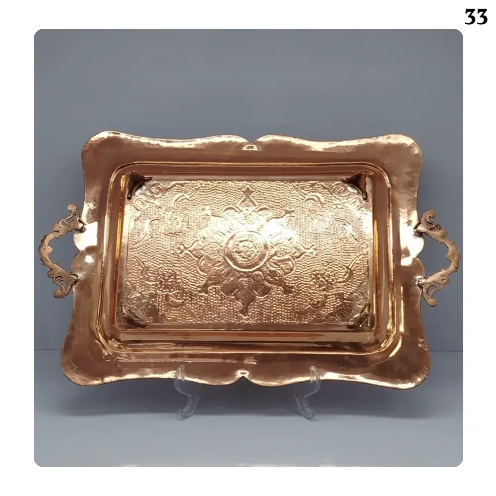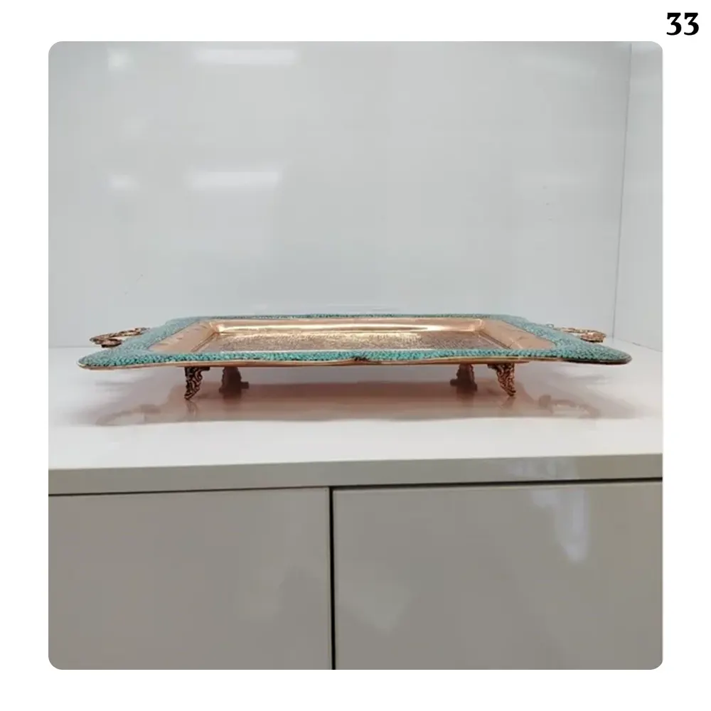 سینی فیروزه کوبی یکی از زیباترین و ماندگارترین جلوههای هنر اصیل ایرانی است که با تلفیق درخشش مس و آرامش رنگ فیروزه، اثری چشمنواز و کاربردی را پدید آورده است. این محصول با ارتفاع ۳ سانتیمتر، ابعاد ۴۹ در ۳۲ سانتیمتر و وزنی حدود ۱۵۰۰ گرم از فلز مس مرغوب ساخته شده است؛ فلزی که به دلیل دوام بالا و مقاومت در برابر تغییر رنگ، انتخابی ایدهآل برای ظروف تزئینی و کاربردی محسوب میشود. سطح سینی با دقت و مهارت استادکاران ماهر با سنگهای فیروزه اصل نیشابور تزئین شده است که به صورت منظم و ظریف در کنار یکدیگر چیده شدهاند تا نمایی یکدست، درخشان و طبیعی ایجاد کنند.